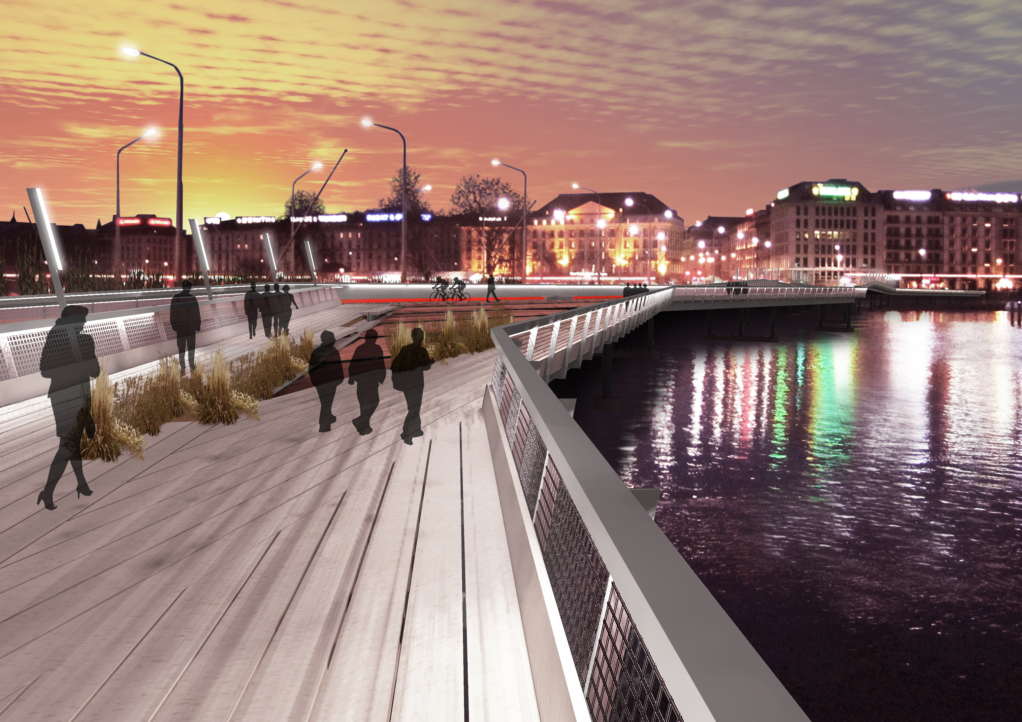Local scale, lake Le Man and Pont du Mont Blanc. The bridge considers, on one side, the ‘dynamic’ public space, which responds to the speed of flow of pedestrians and cyclists, and on the other, the ‘static’ public space, which appears as the geometrical intersticial result of the former and provides different views over the city and the lake.